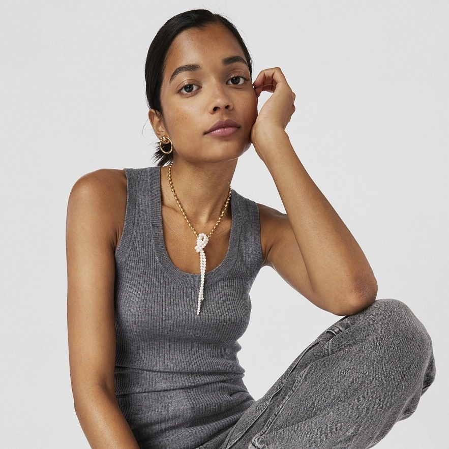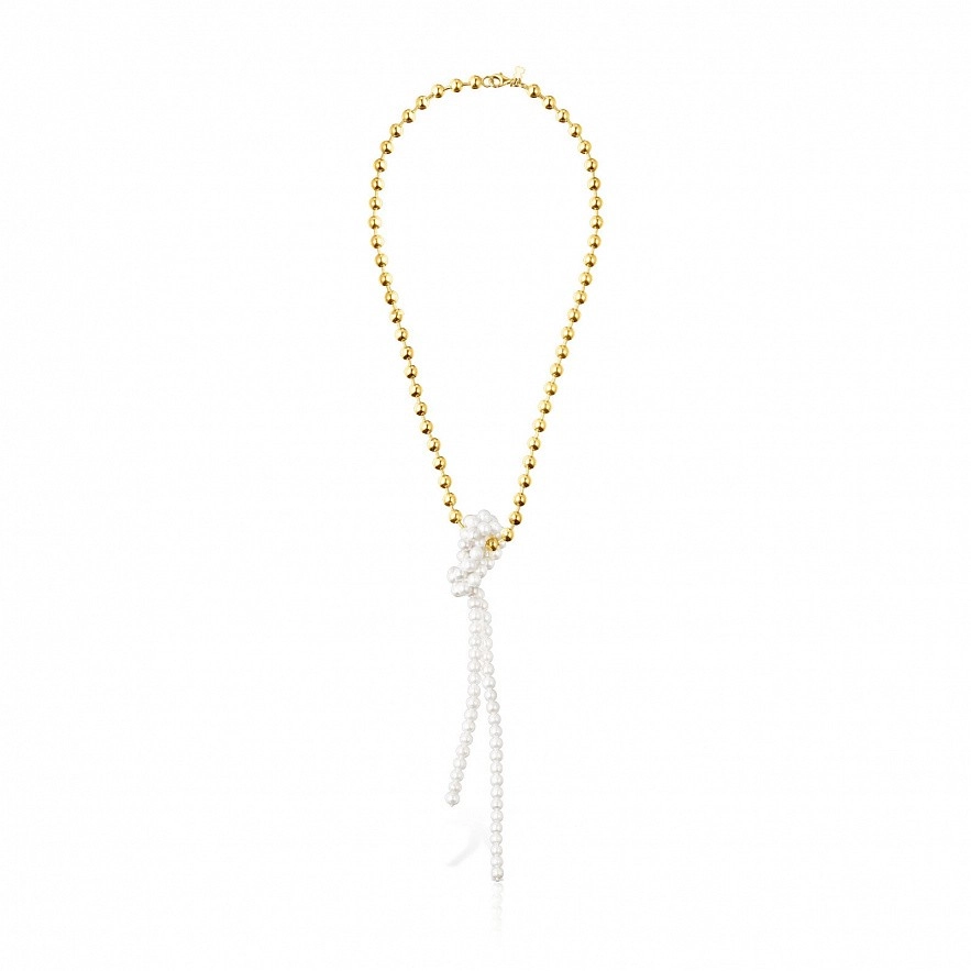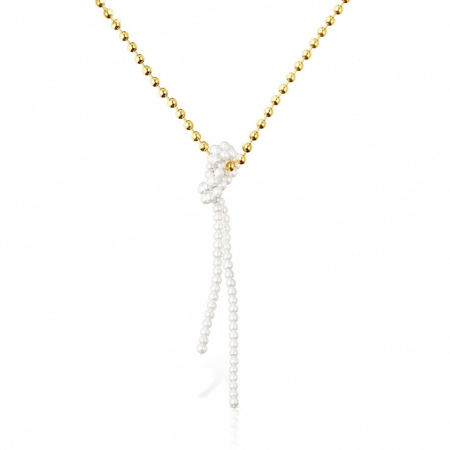 Намисто TOUS Gloss зі срібла 925 проби з покриттям Vermeil з ланцюжком з кульок і ланцюжком з культивованих перлин, зав'язаним по центру. Діаметр кульок: 5 мм. Діаметр культивованих перлин: 5 мм. Довжина кольє: 42 см. Довжина кулона: 14 см. Застібка-лобстер.