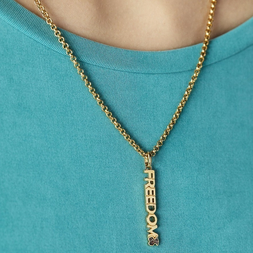 Кулон TOUS Crossword із срібла 925 проби з покриттям Vermeil зі словом FREEDOM та ведмедиком з сапфірів. Vermeil : срібло з покриттям золота 18 карат.