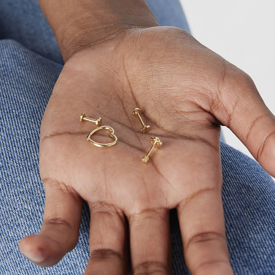 Пірсинг для вух TOUS Basics із 18-каратного жовтого золота із застібкою у формі серця та стрижнем довжиною 8 мм. Виріб виготовлений із біосумісного та гіпоалергенного металу, не стерилізований. Підходить для першого пірсингу. Рекомендовано для носіння у вусі.