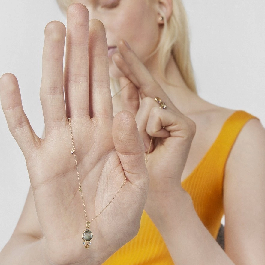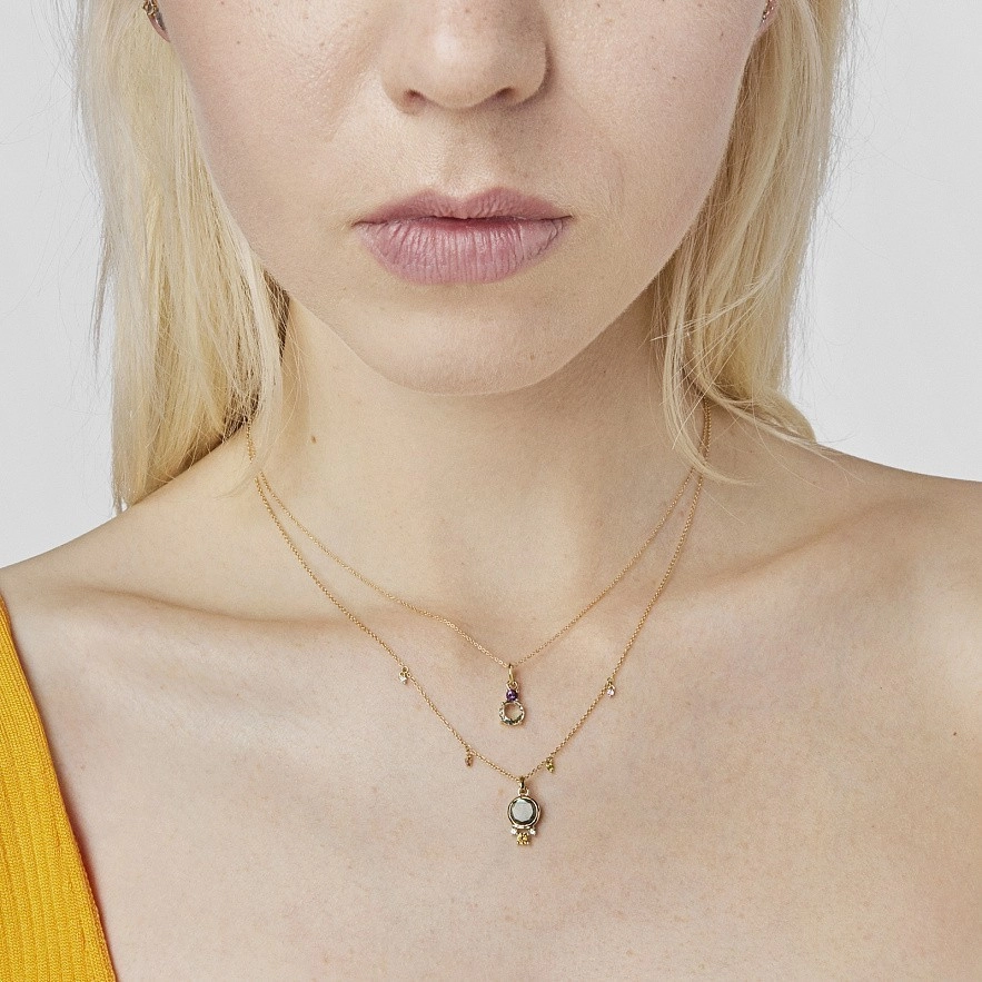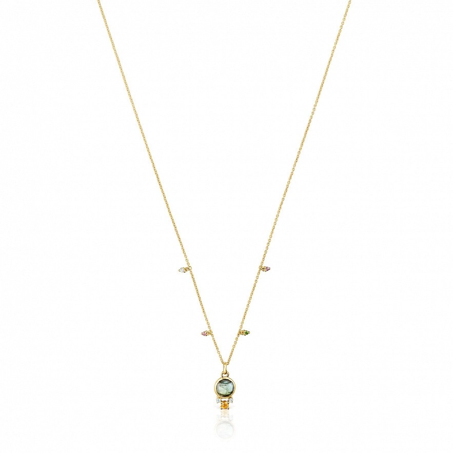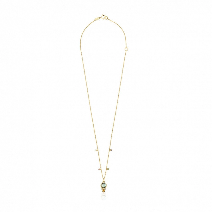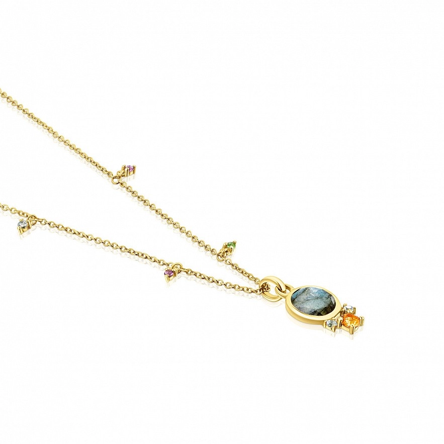 Намисто TOUS Virtual Garden із золота 750 проби з лабрадоритом 7 мм, помаранчевим сапфіром 3 мм і двома блакитними топазами 1,5 мм. Деталі з дорогоцінних каменів навколо ланцюжка: синій топаз, аметист, родоліт та діопсид хрому. Розмір деталей з дорогоцінних каменів: 1,5 мм. Застібка - пружинне кільце. Довжина кольє: 45 см.