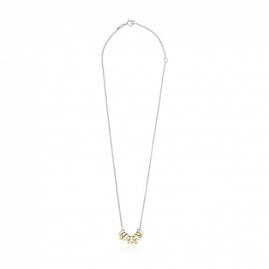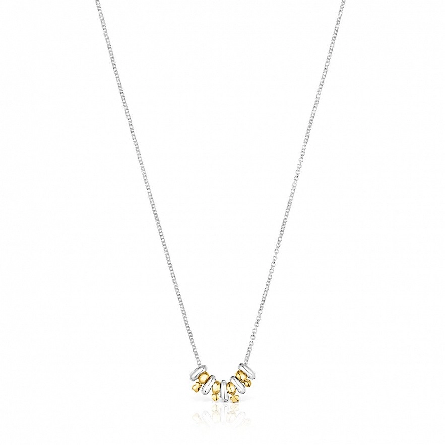 Намисто TOUS Virtual Garden зі стерлінгового срібла з підвісками, що чергуються в сріблі та сріблі з покриттям Vermeil . Підвіски у сріблі: 7,5 х 3 мм. Підвіски з покриттям Vermeil : кулька 4,5 х 3 мм, ведмедик 4,5 х 3,5 мм, серце 4,5 х 3 мм, зірка 4,5 х 3,3 мм. Довжина ланцюжка: 40/45 см. Vermeil : срібло з покриттям золота 18 карат.