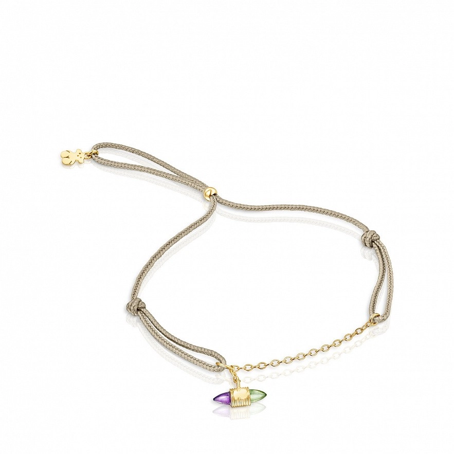 Браслет TOUS Lure із золота 750 проби і нейлону з ланцюжком і підвісним золотим шармом з ведмедиком 2,8 мм, аметистом і перидотом. Розмір дорогоцінних каменів: 5 х 2,5 мм. Довжина мотиву на кулоні: 6 мм. Застібка-слайдер.