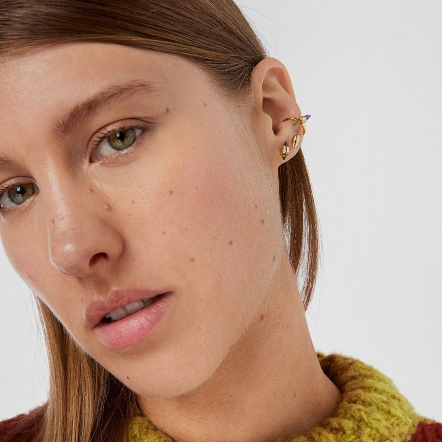 Золота сережка 750 проби TOUS Lure з дорогоцінними каменями і з деталлю ведмедика 2,8 мм в центрі мотиву, що з'єднує аметист і перидот. Розмір дорогоцінних каменів: 7,5 х 2,6 мм. Розмір мотиву: 15 мм. Отвір сережки: 4 мм.