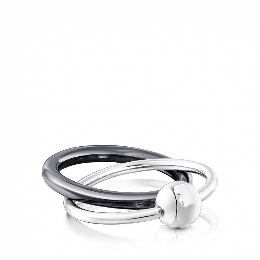 Подвійна каблучка TOUS Plump із срібла та темного срібла з двома переплетеними кільцями та деталлю у вигляді кульки розміром 7мм з вигравіруваним ведмедем розміром 3мм. Товщина кілець: 1,8 та 3мм.