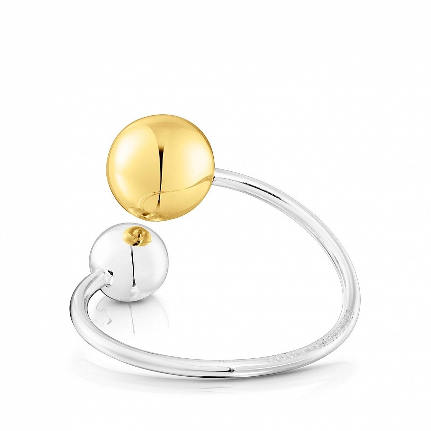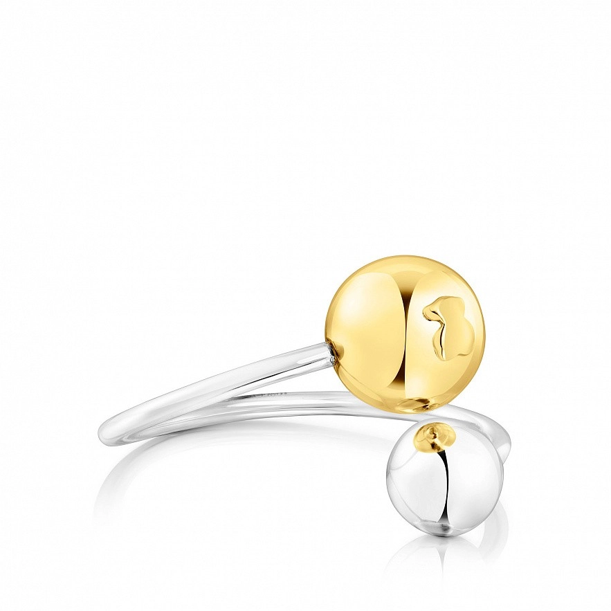 Пухка відкрита каблучка TOUS зі срібла та срібної вермелі з двома деталями у формі кулі та вигравіруваним ведмедиком розміром 3мм. Діаметр срібної вермеельної кульки: 8мм. Діаметр срібної кульки: 6мм. Товщина каблучки: 1,5мм.