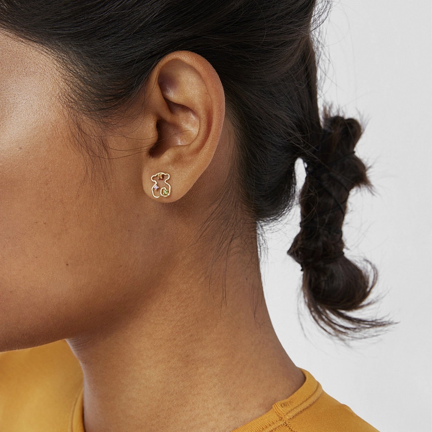 Сережки TOUS Tsuri Bear із золота 750 проби з дорогоцінними каменями, розташованими навколо силуету ведмедя. Камені: гранат, аметист та діопсид хрому. Розмір каміння: 1,5 мм. Розмір овалу: 12 мм.