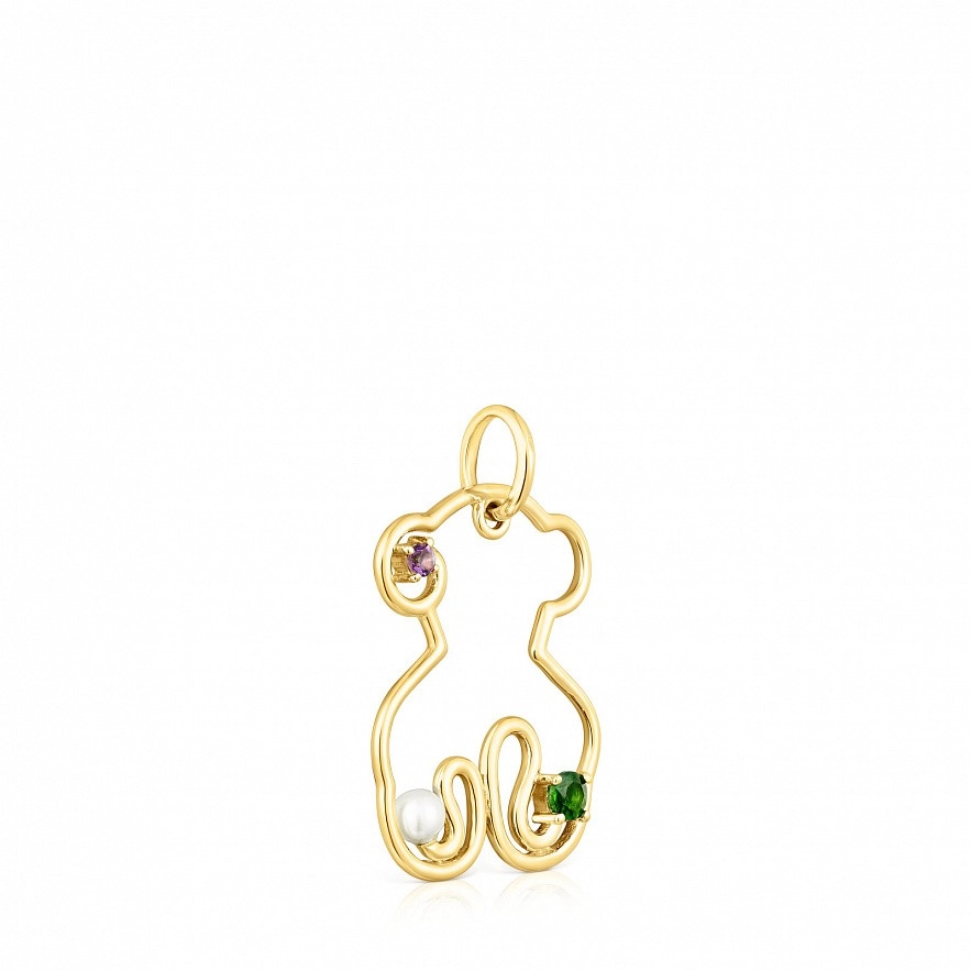 Підвіска-ведмедик TOUS Tsuri з золота 750 проби з дорогоцінними каменями та культивованою перлиною. Дорогоцінні камені закріплені навколо силуету ведмедика. Камені: аметист та діопсид хрому. Розмір дорогоцінних каменів: 1,75 х 2,5 мм. Розмір культивованої перлини: 3 мм. Розмір ведмедика: 20 мм. Ланцюжок в комплект не входить.