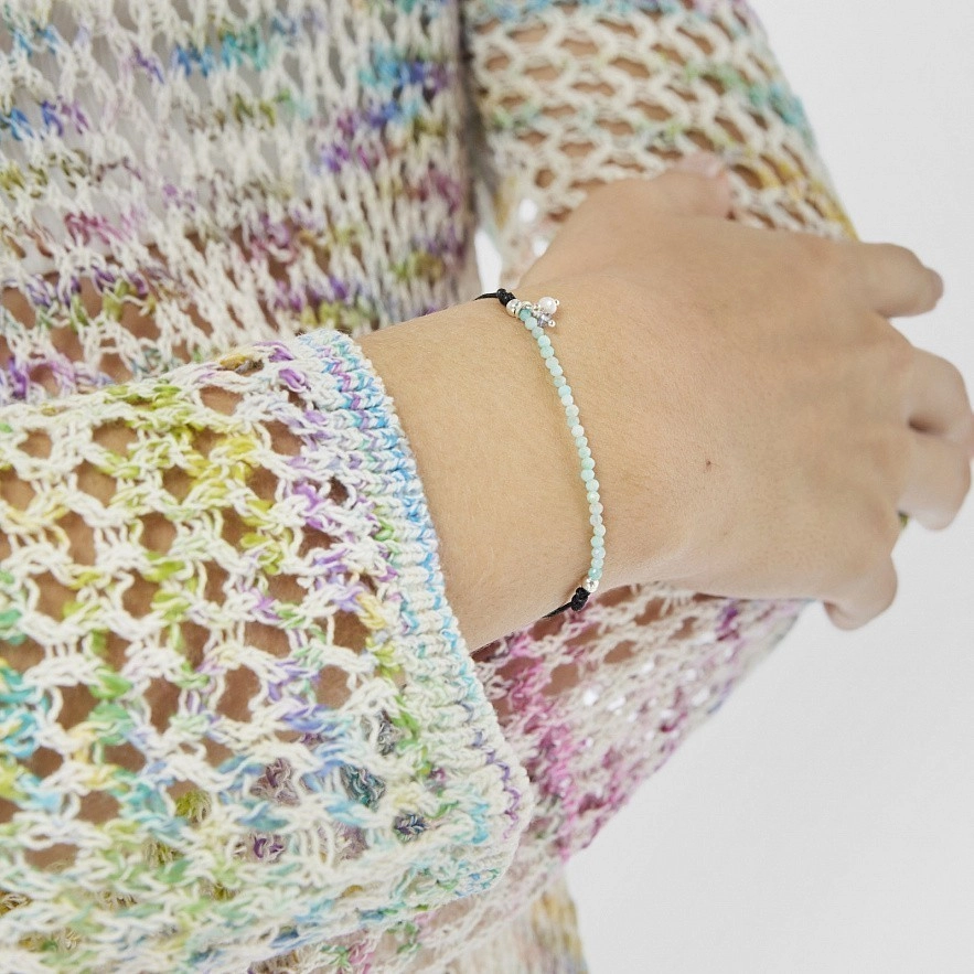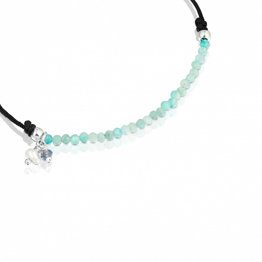 Браслет TOUS Camille з чорного нейлону і срібла 925 проби з амазонітами розміром 2-2,5 мм і підвіскою з культивованою перлиною розміром 3-3,5 мм та іолітом розміром 3 мм.