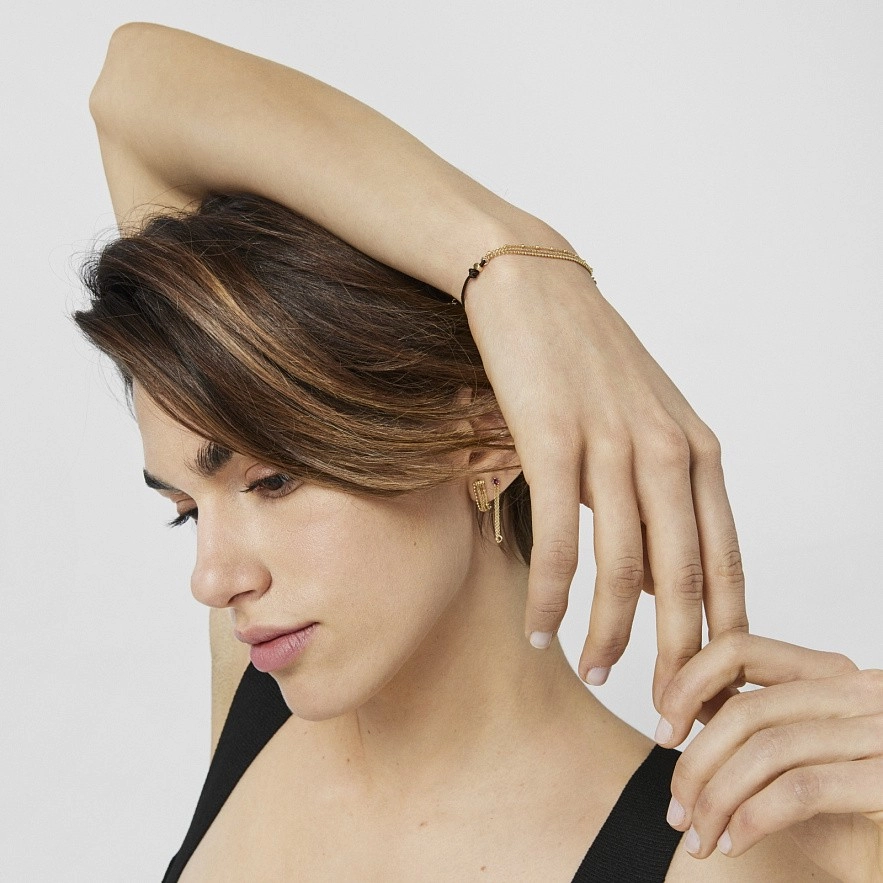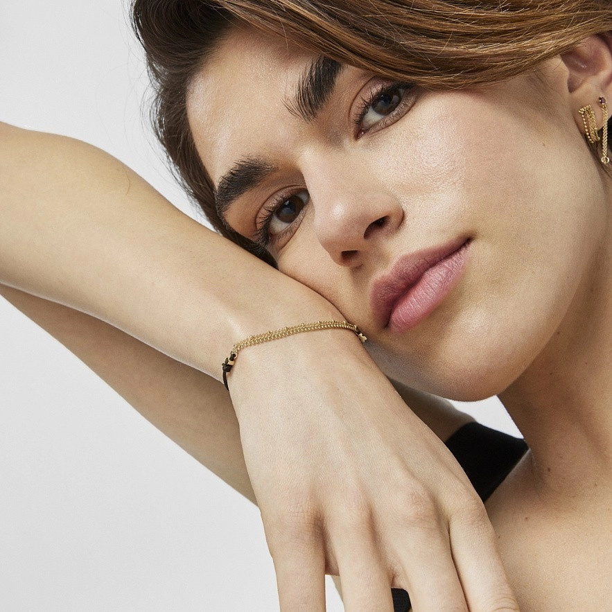 Браслет TOUS Cool Joy з чорного нейлону і 18-каратного золота з трьома ланцюжками: один кулькового плетіння, другий простий і третій ланцюжок з кульками. Мотив ведмежа: 3,5 мм. Загальна довжина: 12,2 см.