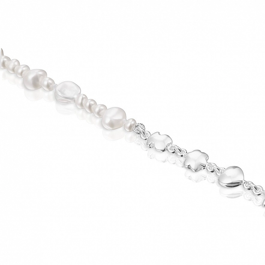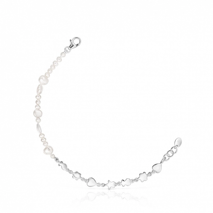 TOUS Mini Icons браслет зі срібла 925 проби з ведмедиком, квіткою, серцем і зіркою на одній половині: 5-6мм. На іншій половині — культивовані прісноводні перлини різного розміру: 3,5мм, 7мм і 9мм. Довжина: 17,5см. Застібка лобстер.