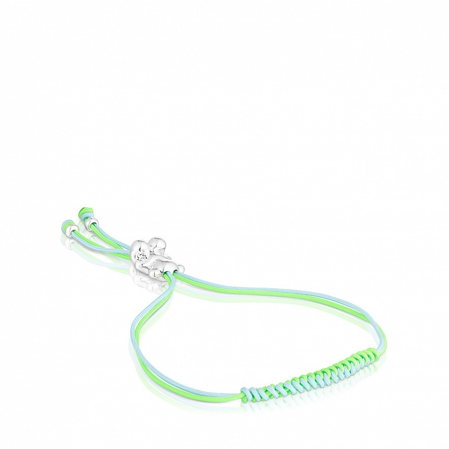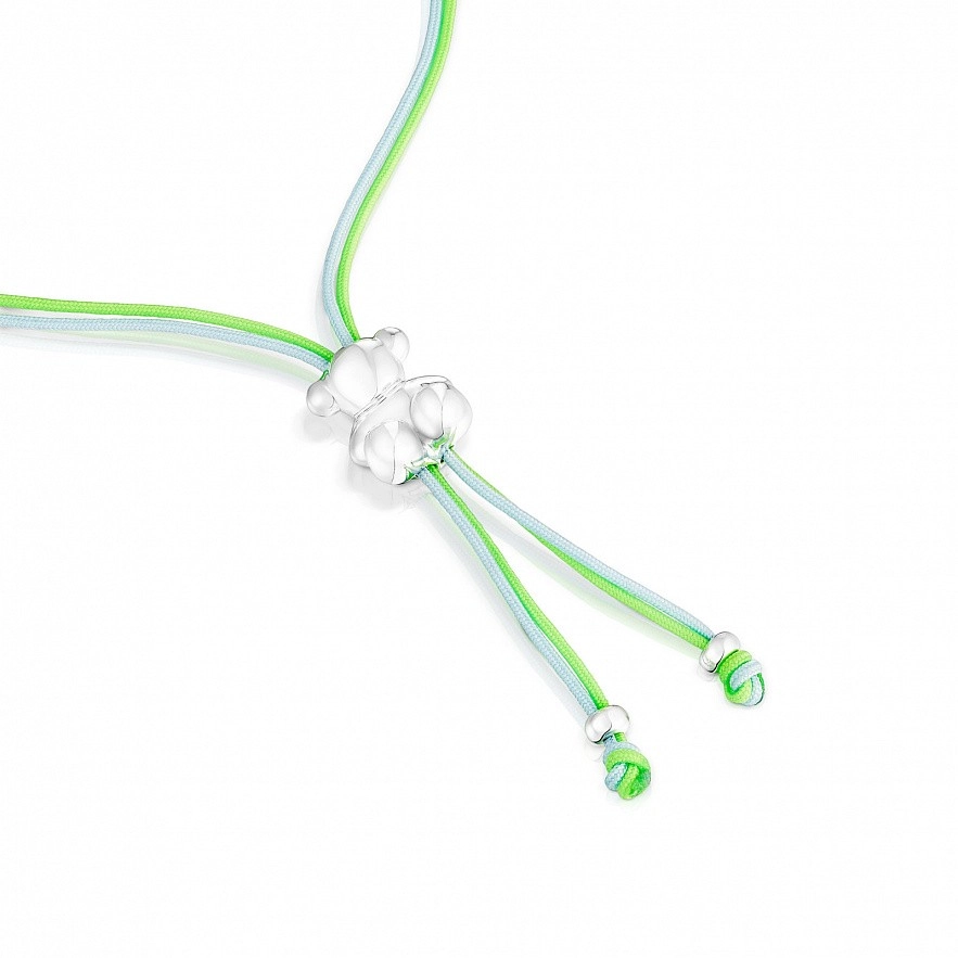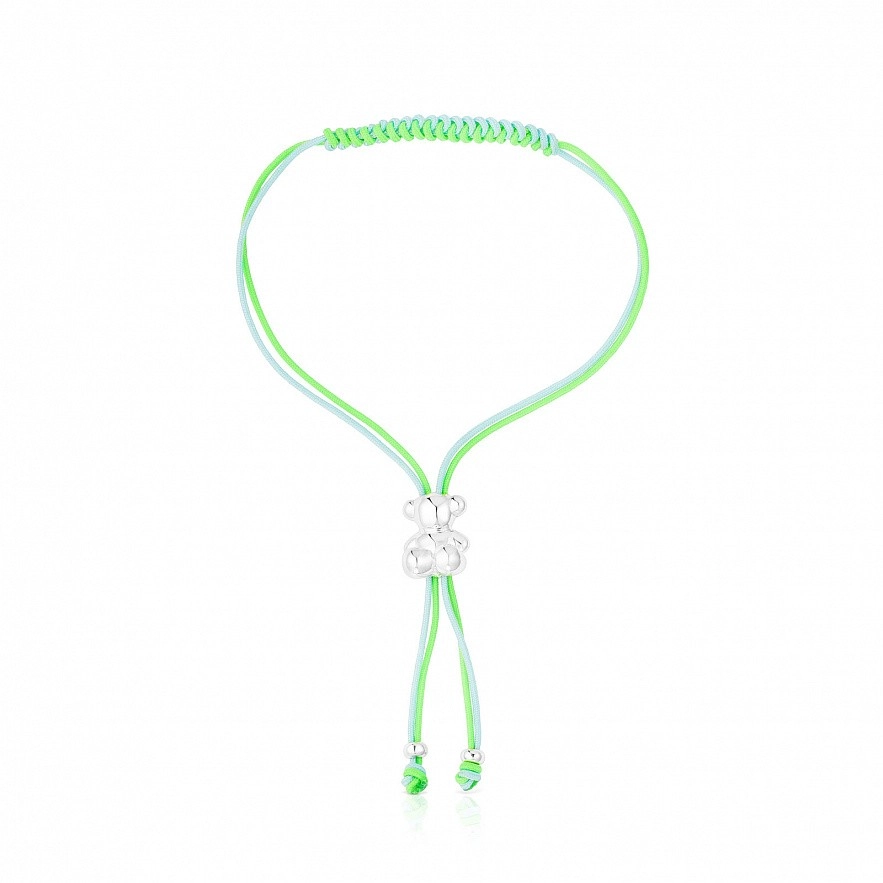 Браслет TOUS Bold Bear із двома переплетеними поліестеровими шнурами неоново-зеленого та небесно-блакитного кольорів із ведмедиком. Розмір ведмедика: 11 мм. Загальна довжина: 22 см. Розсувна застібка-ведмедик.