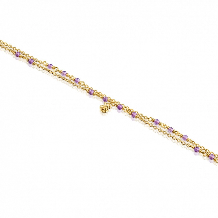 TOUS Bold Bear браслет зі срібла 925 проби з покриттям Vermeil та аметисту, що складається з двох ланцюжків, які з’єднані на кінцях, одна з яких має срібну підвіску у вигляді ведмедя зі срібла 925 проби з покриттям Vermeil . Розмір дорогоцінних каменів: 2-2,5мм. Розмір ведмедика: 5,35мм. Довжина браслета: 17,5см. Застібка-лобстер.