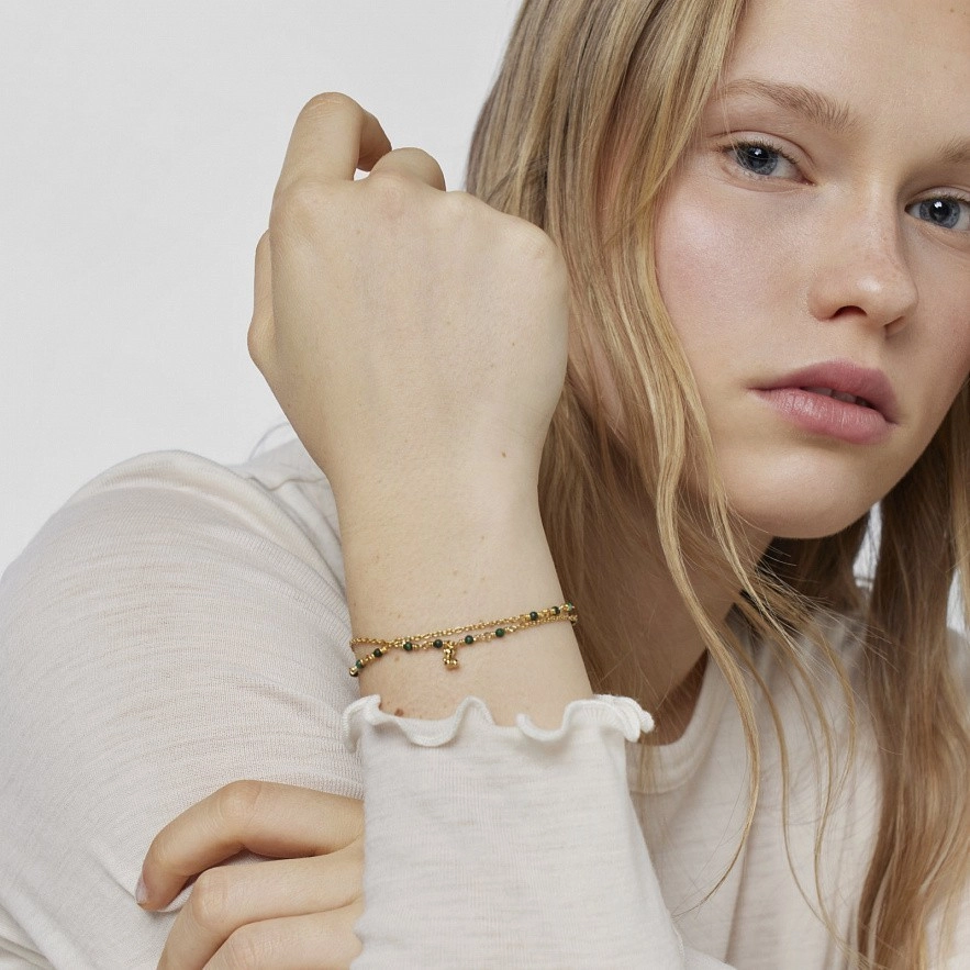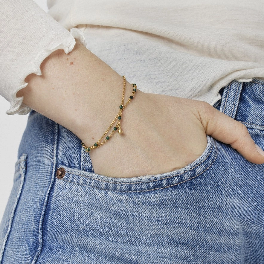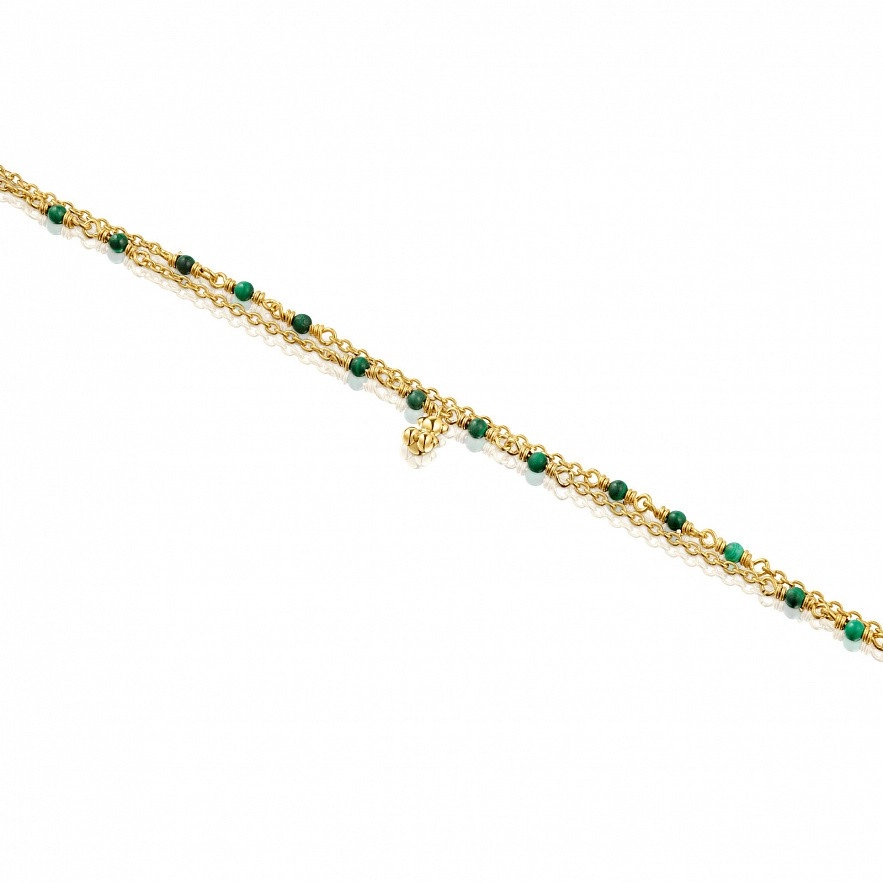 TOUS Bold Bear браслет зі срібла 925 проби з покриттям Vermeil та малахіту, що складається з двох ланцюжків, які з’єднані на кінцях, одна з яких має підвіску із мотивом ведмедя зі срібла 925 проби з покриттям Vermeil . Розмір дорогоцінних каменів: 2-2,5мм. Розмір ведмедика: 5,35мм. Довжина браслета: 17,5см. Застібка-лобстер.