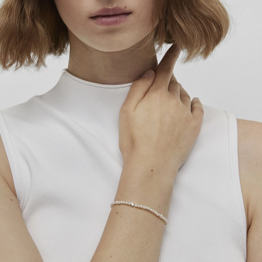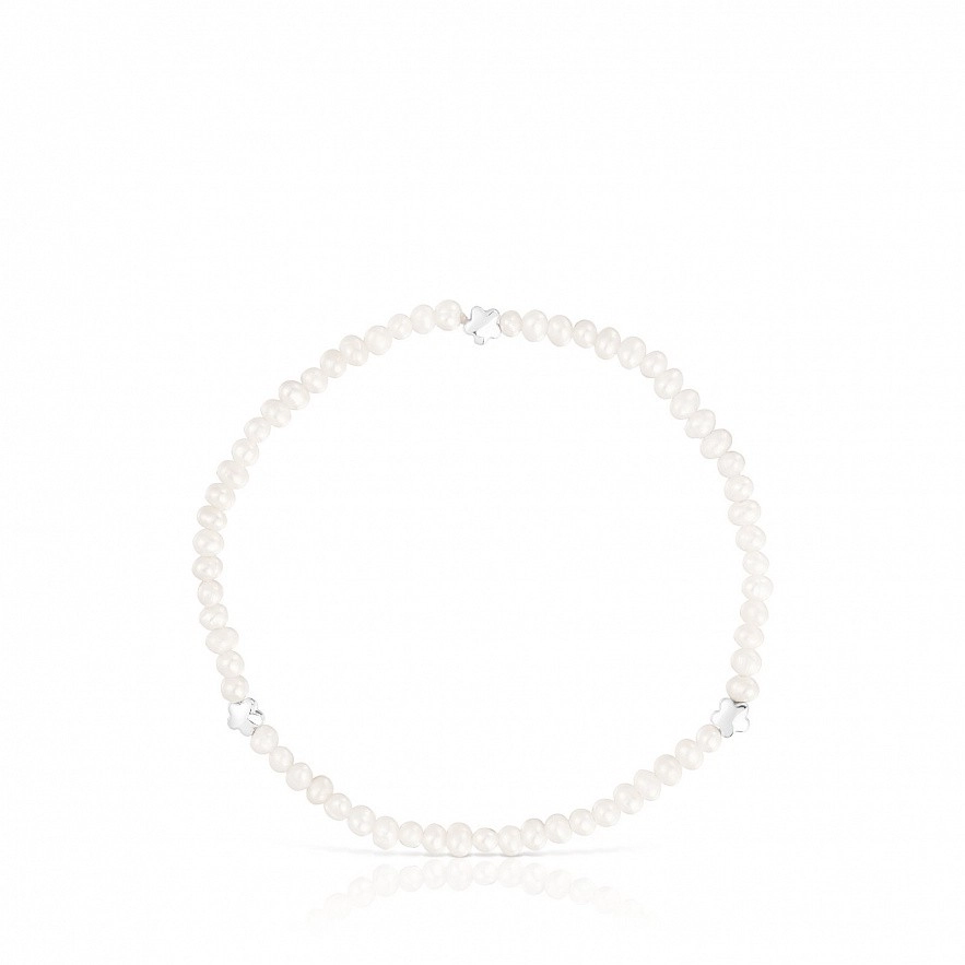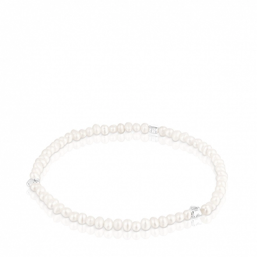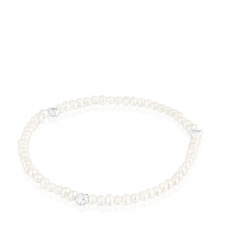 Еластичний браслет TOUS Bold Motif із культивованими перлами та трьома квітковими мотивами, що чергуються, зі срібла. Розмір культивованих перлин: 3-3,5 мм. Розмір квітки: 4 мм. Довжина браслета: 17,5 см.