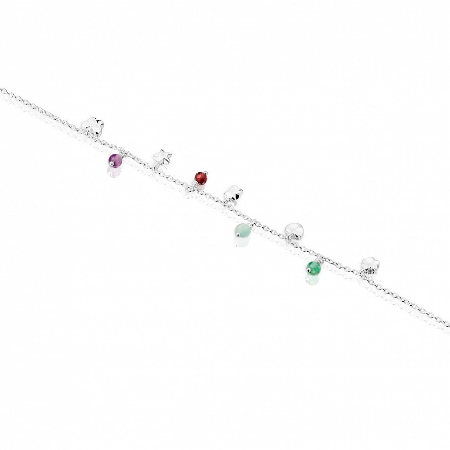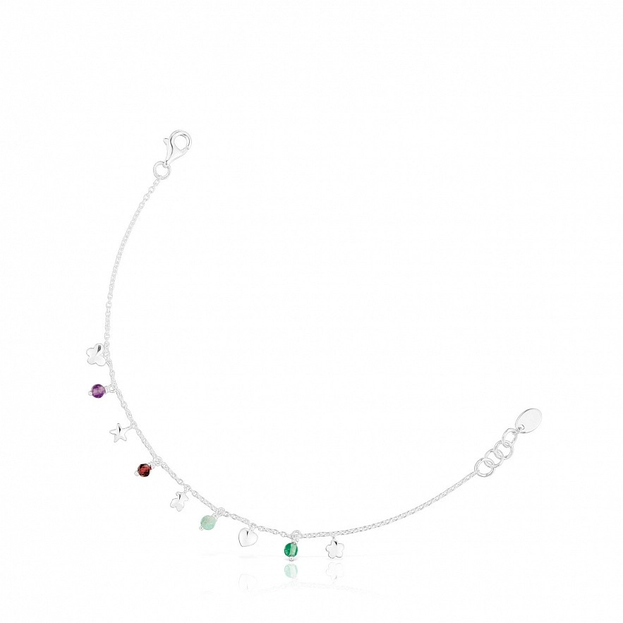 Браслет TOUS Bold Motif зі срібла 925 проби з дорогоцінним камінням і мотивами. Дорогоцінні камені: аметист, оброблений халцедон, амазоніт і огранений родоліт. Розмір дорогоцінних каменів: 3-3,5 мм. Мотиви: ведмідь, метелик, квітка, серце і зірка. Розмір мотивів: 4 мм. Довжина браслета: 17,5 см. Застібка лобстер.