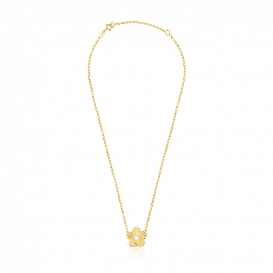 Намисто TOUS Iris Motif зі срібла 925 проби з покриттям Vermeil із силуетом квітки та культивованою перлиною в центрі. Розмір мотиву: 18мм. Розмір культивованої перлини: 4мм. Довжина намиста: 40-45см. Пружинна застібка-кільце.