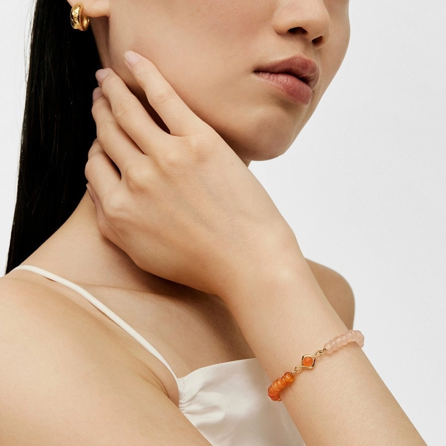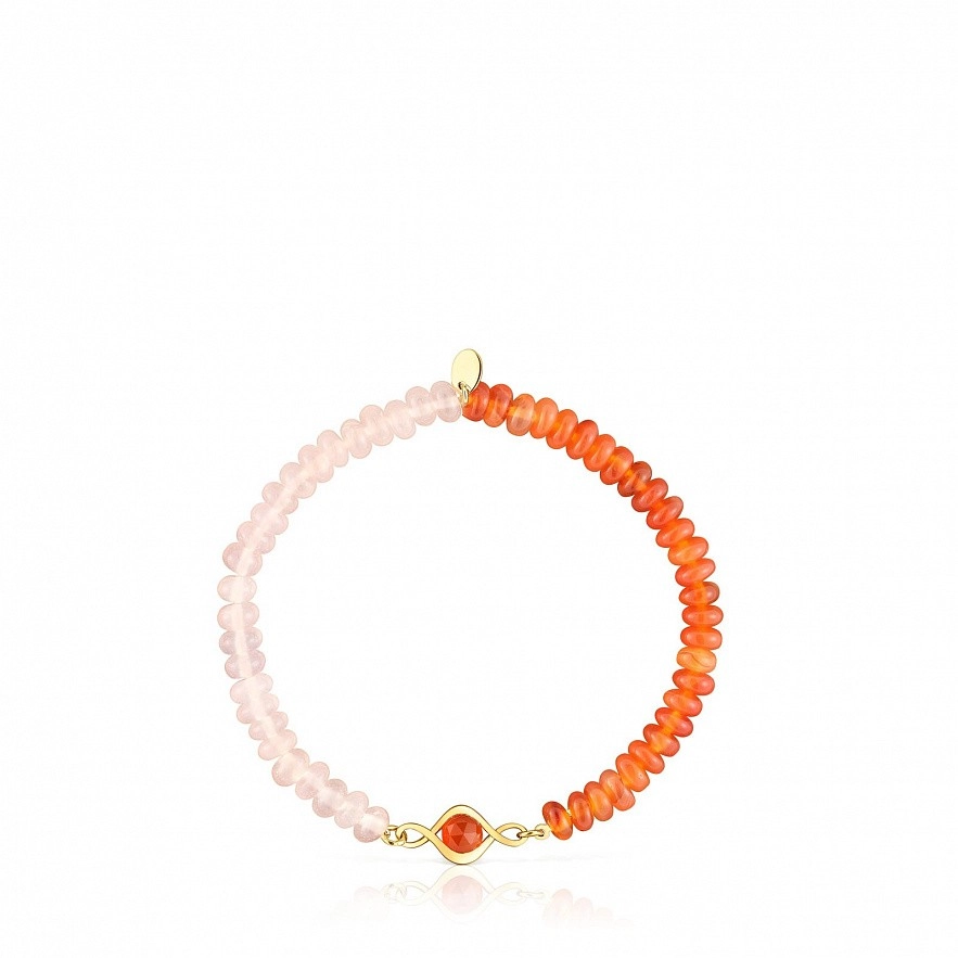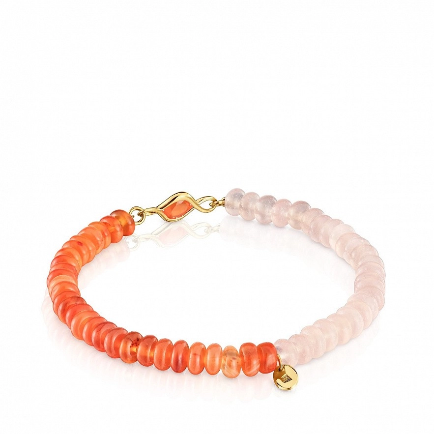Еластичний браслет TOUS Alma Motif зі срібла 925 проби з покриттям Vermeil . Браслет з дорогоцінними каменями: сердолік 5 мм і халцедон 3 мм. Довжина браслета: 16,5 см. Виріб із срібла 925 проби з позолотою від 18 до 23 кт і товщиною 3 мікрони. Ця якість гарантує більшу довговічність коштовності.