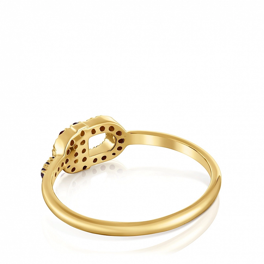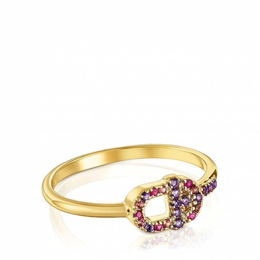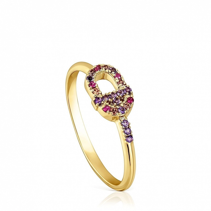 Каблучка TOUS Manifesto із 18-каратного золота з дорогоцінними каміннями. Дорогоцінні каміння: аметист, рубін і сапфір. Розмір дорогоцінних каменів: 0,8-1,1мм. Розмір мотиву: 6,7мм. Товщина каблучки: 1,44мм.