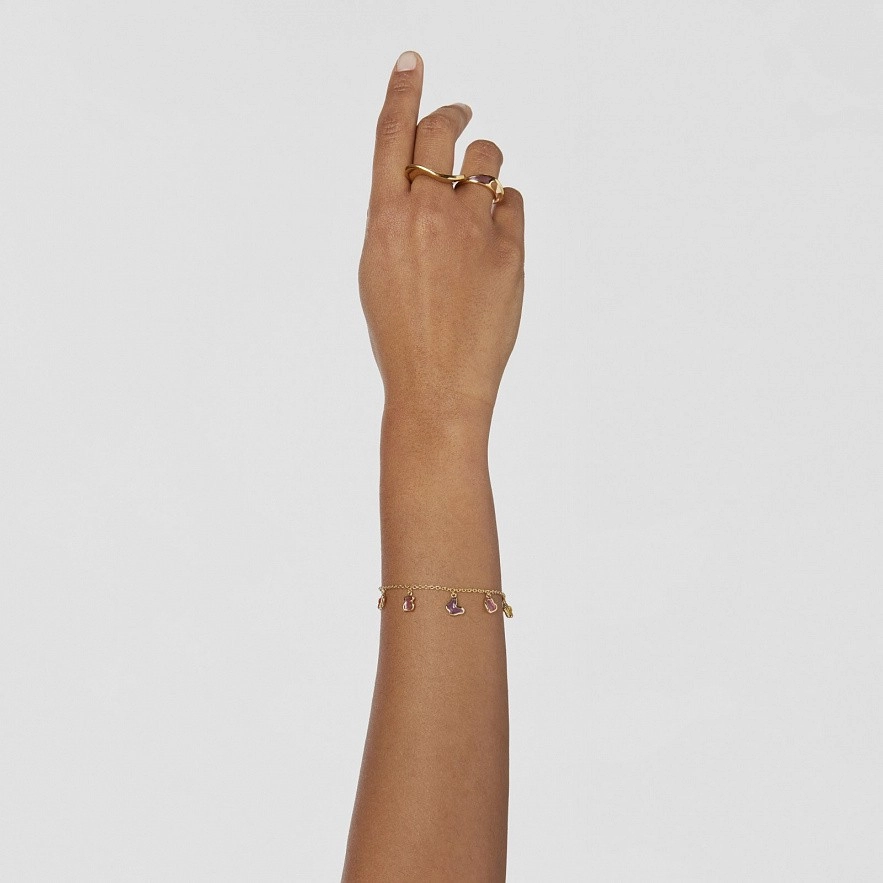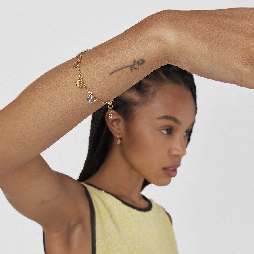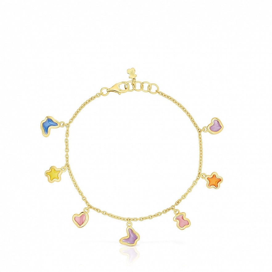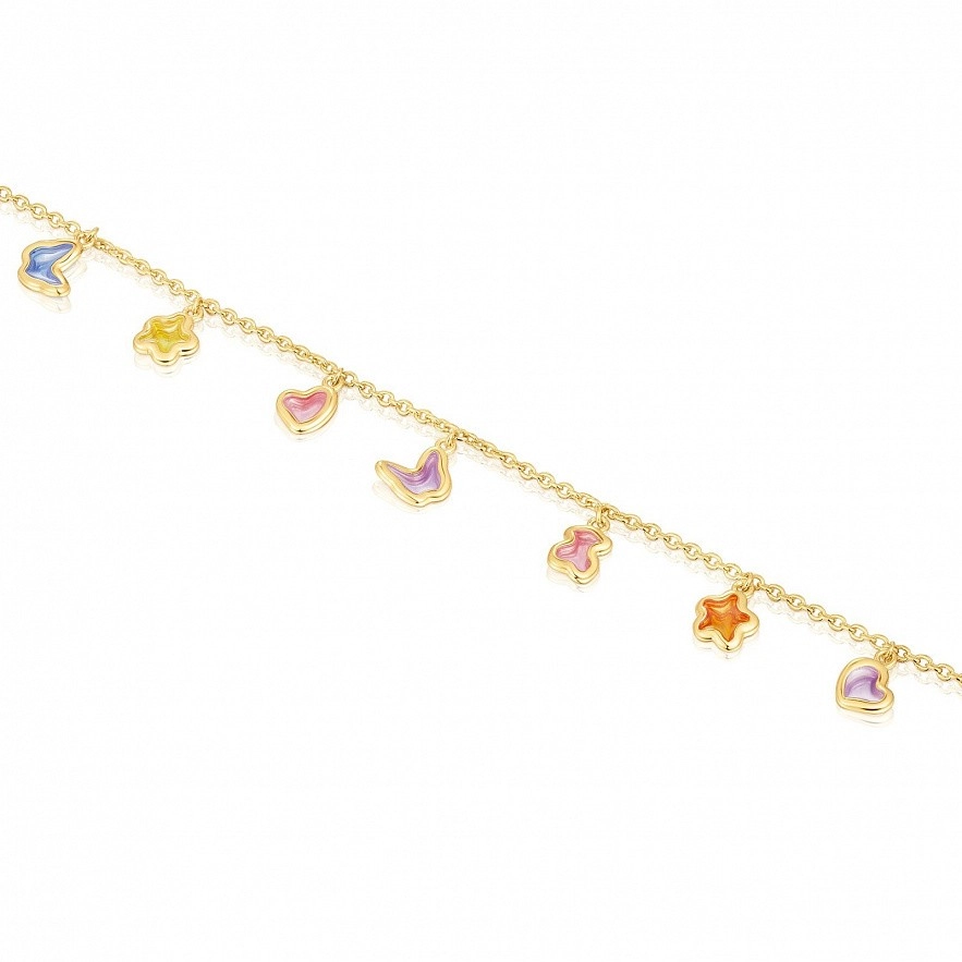 Браслет TOUS Gregal зі срібла 925 проби з покриттям Vermeil та сімома мотивами: із жовтою, оранжевою, рожевою, блакитною та бузковою емаллю. Розміри мотивів: метелик 7 х 8,3 мм, ведмедик 7 х 5,9 мм, квітка 7 х 7,2 мм і серце 7 х 6,4 мм. Довжина браслета: 17,5см. Застібка-лобстер.