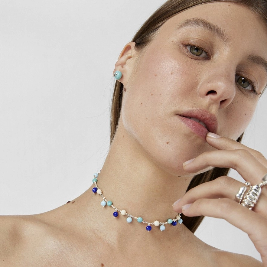 Регульоване намисто TOUS Icon Colors зі срібла 925 проби та нейлону блакитного кольору з кульками з кольорового муранського скла, як фіксованими, так і висячими. Розмір кульок: приблизно 6мм. Загальна довжина: 70см. Застібка-повзунок.