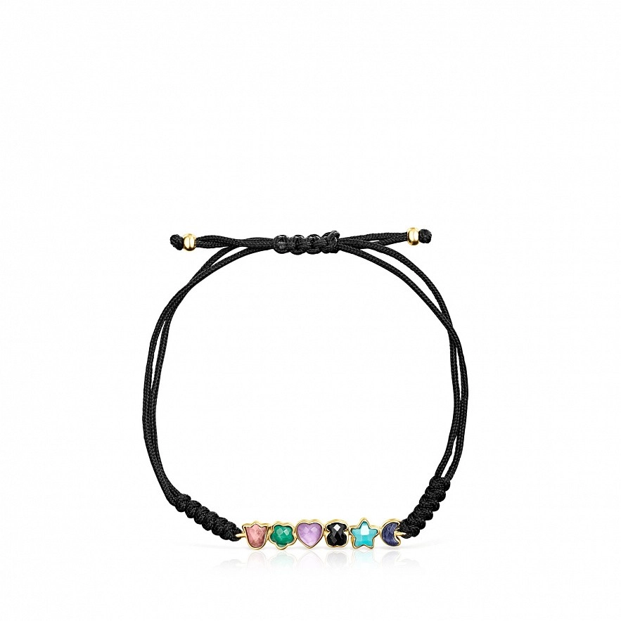 Браслет TOUS Glory зі срібла 925 проби з покриттям Vermeil з 6 фігурками з содаліту, бірюзи, оніксу, аметисту, малахіту і родоніту, на чорному шнурку. Розміри: 0,2-0,5 см. Довжина: 21,5 см. Vermeil : срібло, покрите шаром жовтого золота 18kt.